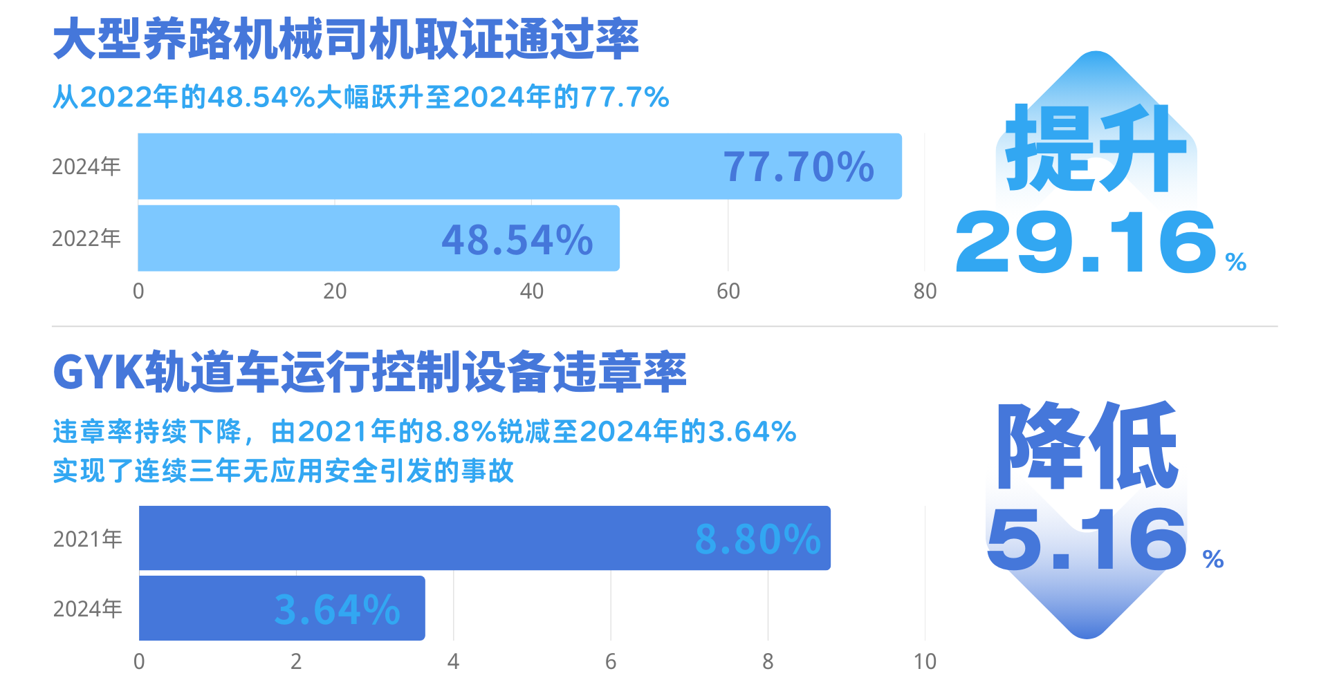 ●大型养路机械司机取证顺利获得率从 48.54%(2022)提升至 77.7%(2024)
